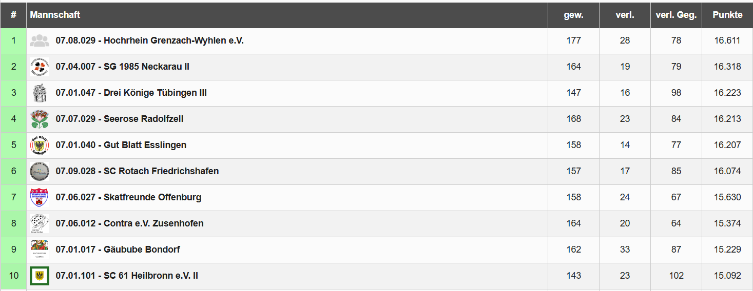 Auszug aus dem Offizielles Endergebnis der Baden Württembergischen Manschaftsmeisterschaft ( Es gab 41 Teilnehmer, gezeigt wird nur das Ergebnis der für die Deutschen Meisterschaft qualifizierten Teams )